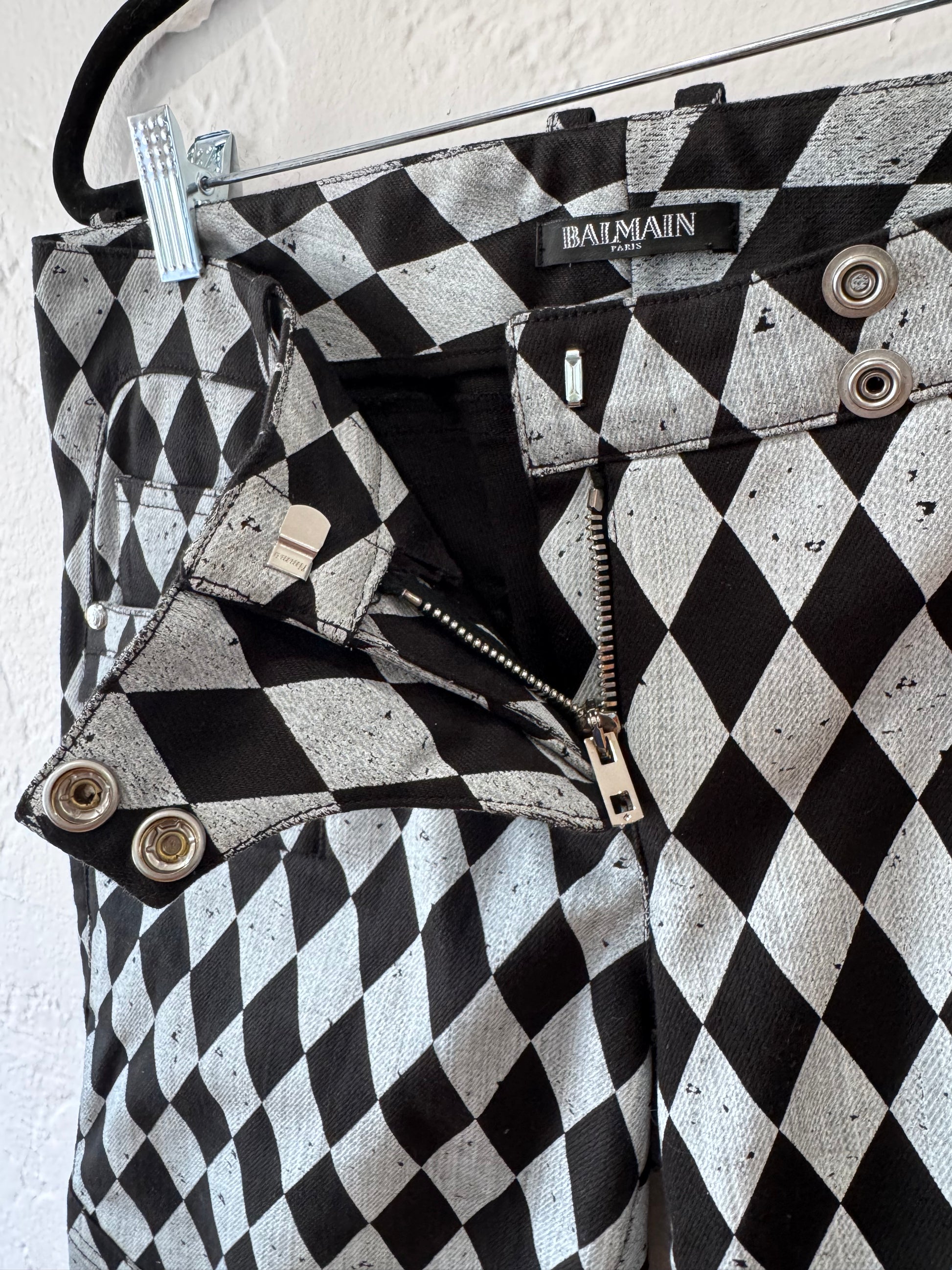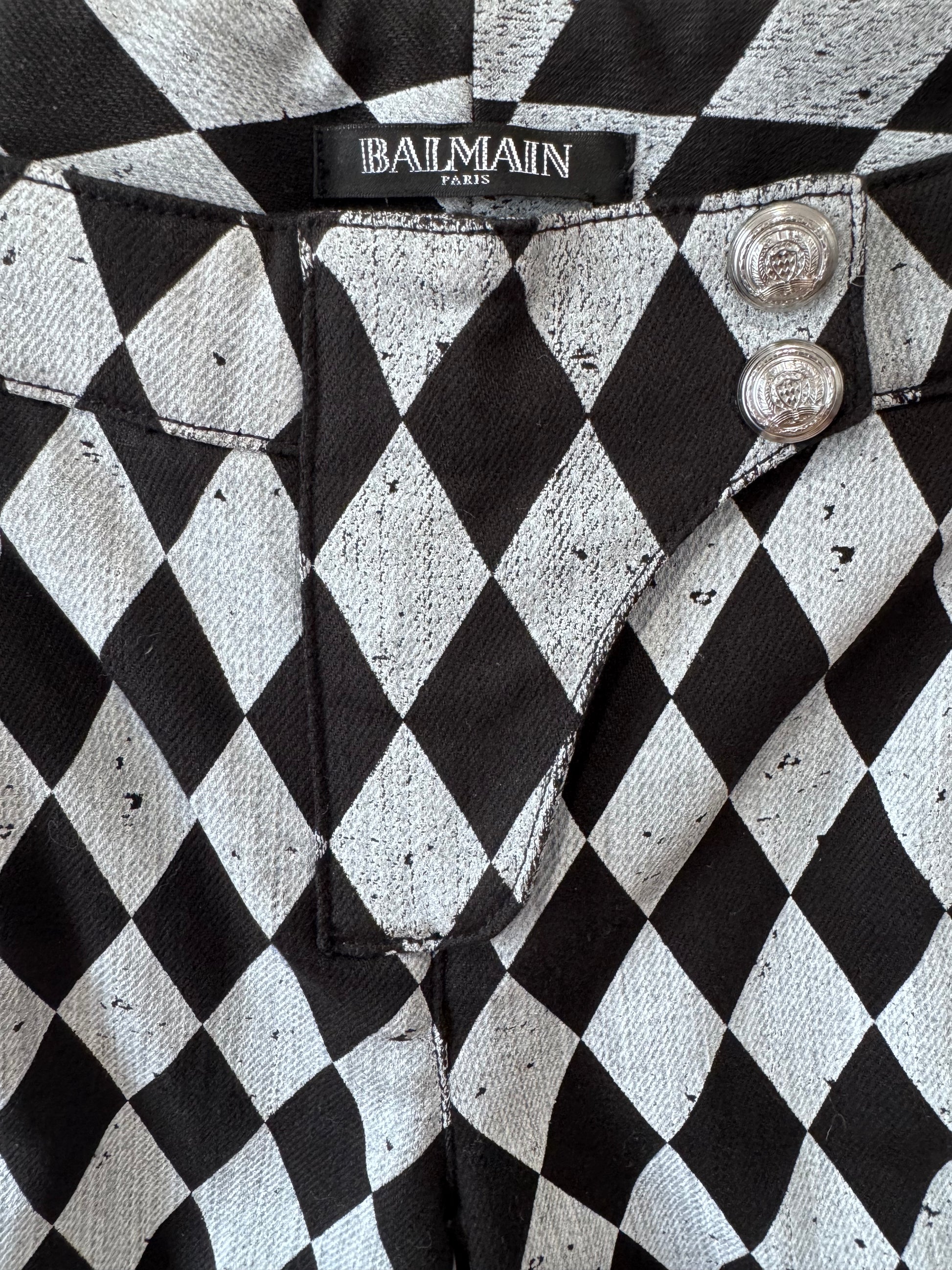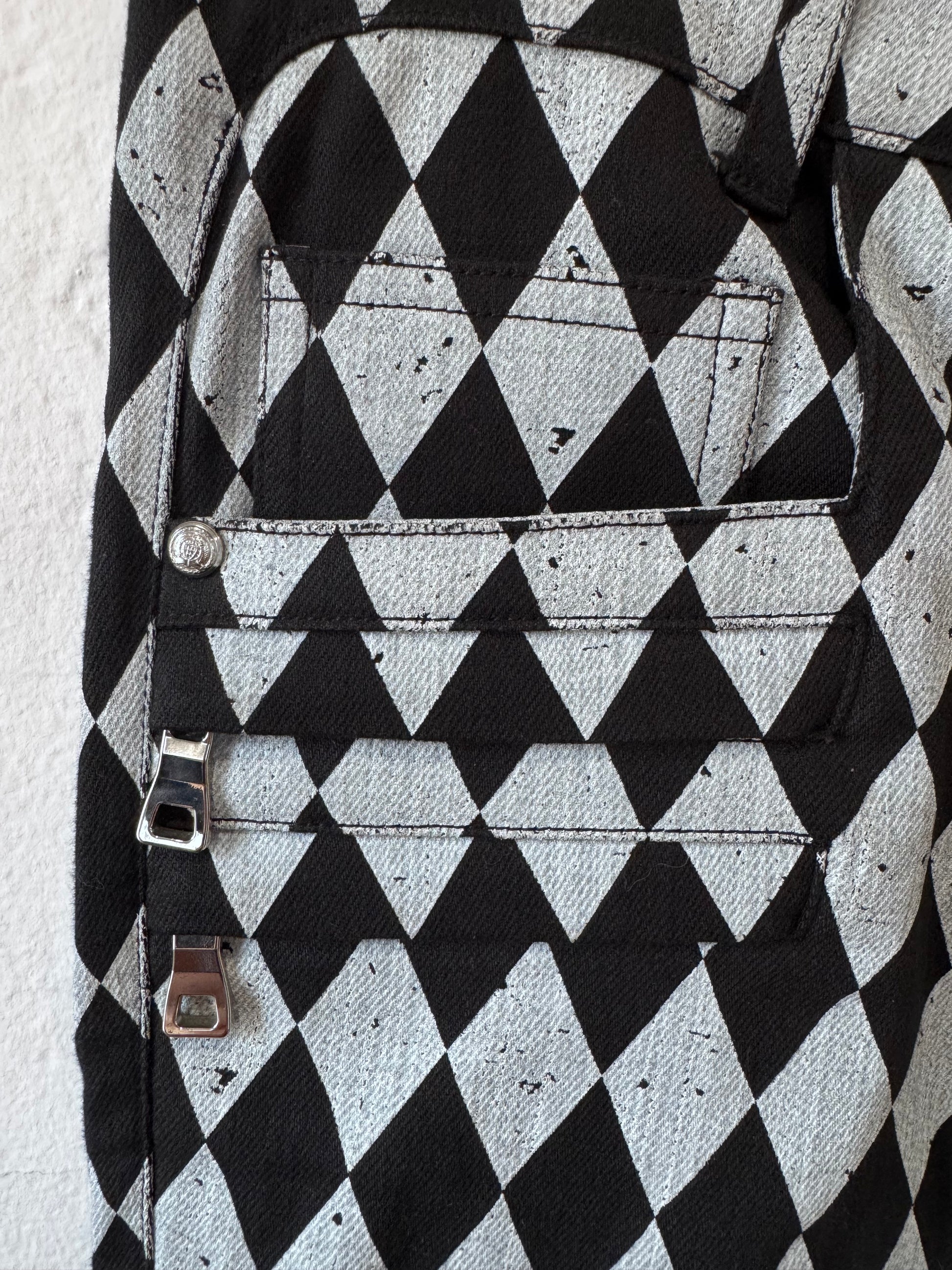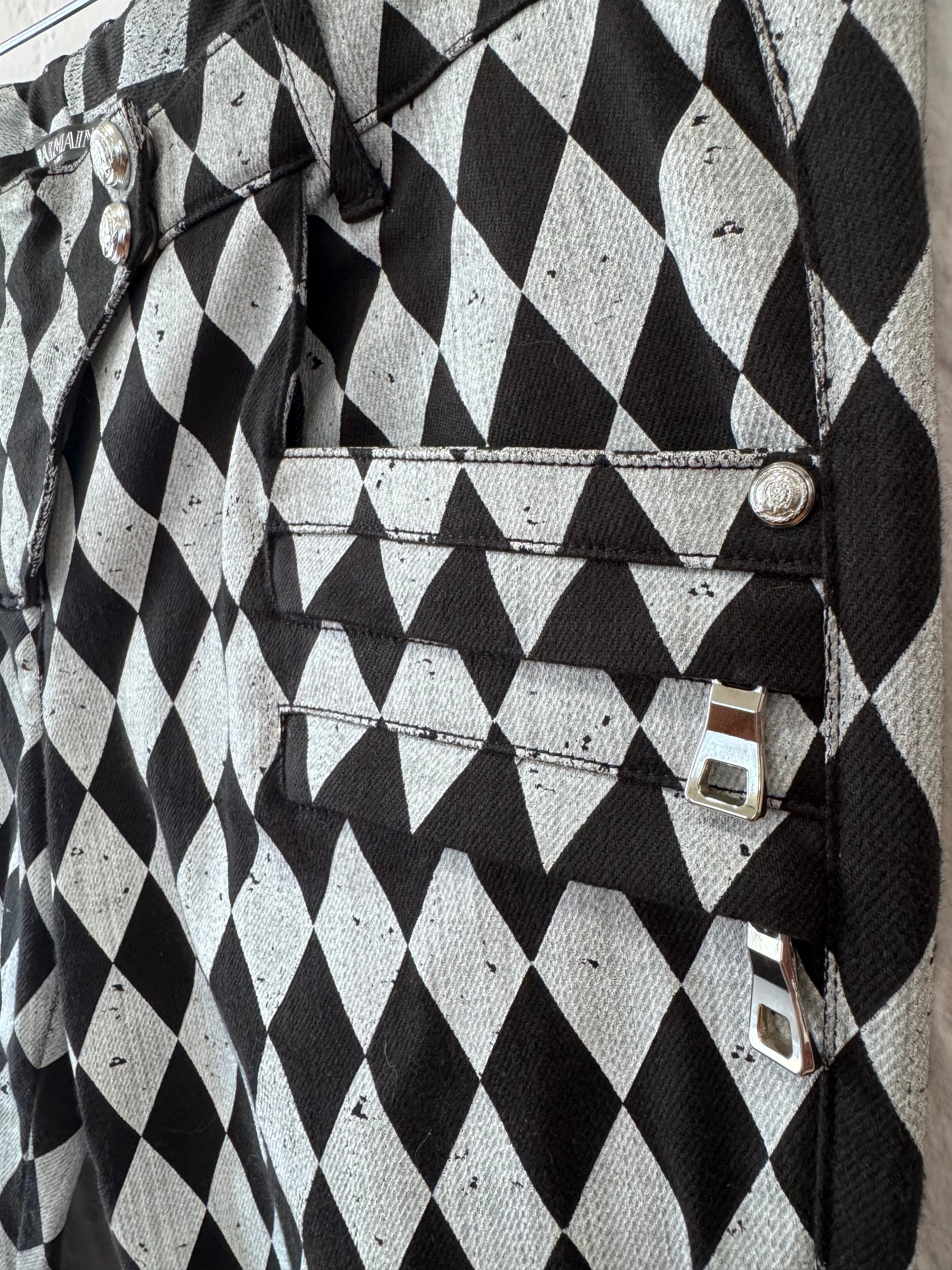 Cut from a thick cotton blend with a touch of stretch, they sculpt the body with precision while paneled moto stitching adds a dose of rock-and-roll attitude. The black-and-white harlequin print gives them a graphic edge, balanced by silver crest buttons and buckle hardware that gleam against the bold pattern.