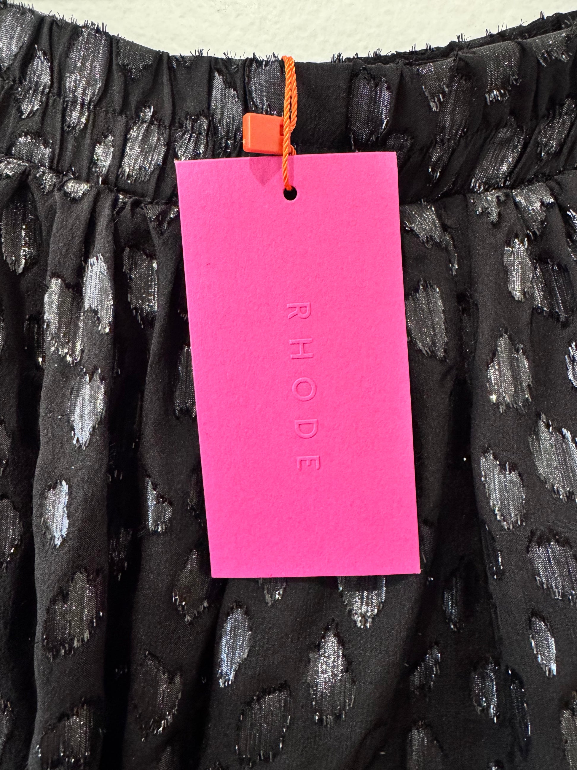Designed to shimmer without shouting, this Rhode skirt moves with quiet confidence. Cut from lightweight metallic jacquard, it catches light in motion—softly glinting with every step. Tiered ruffles add volume and flow, while an elastic waistband keeps the silhouette effortless and easy to wear.