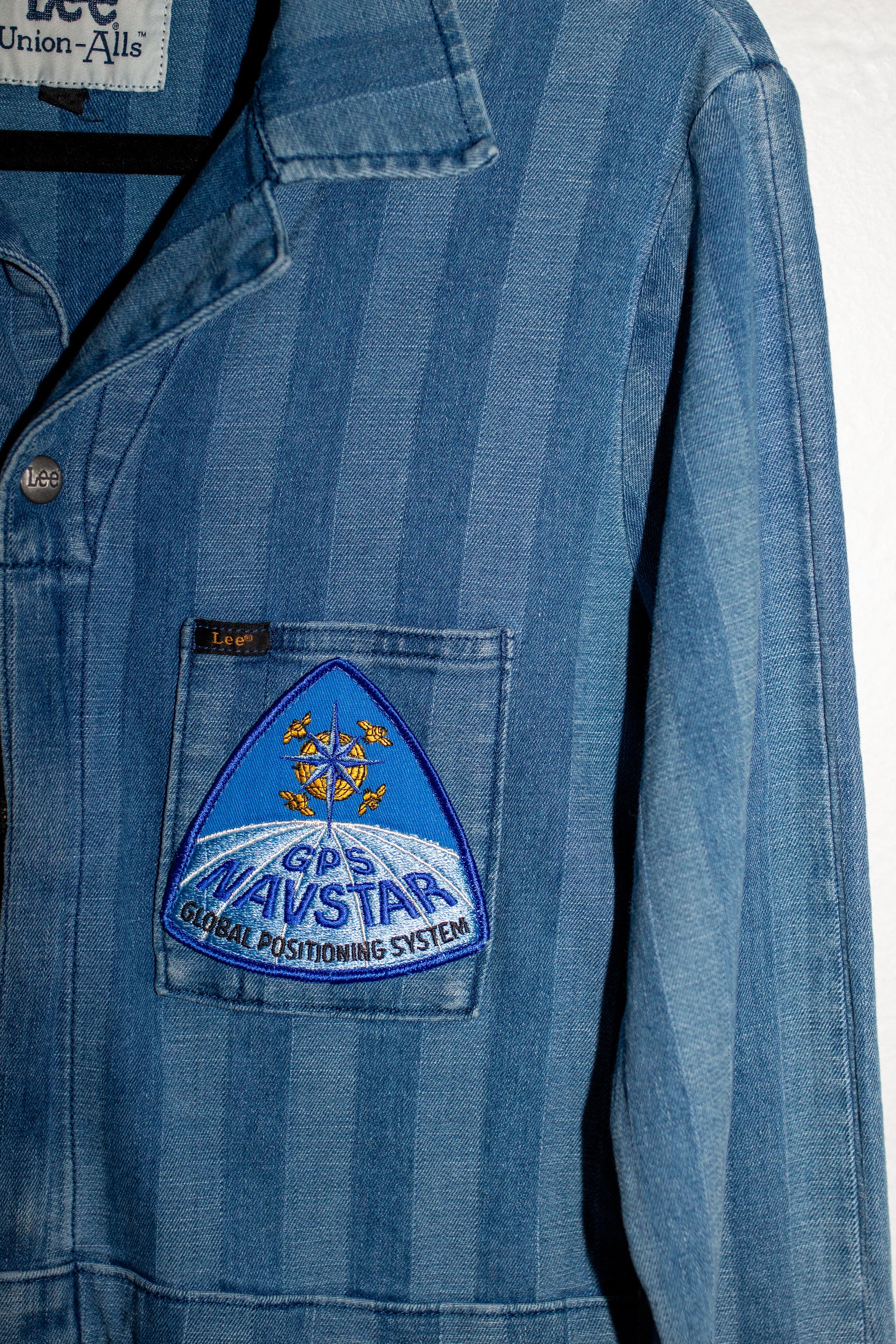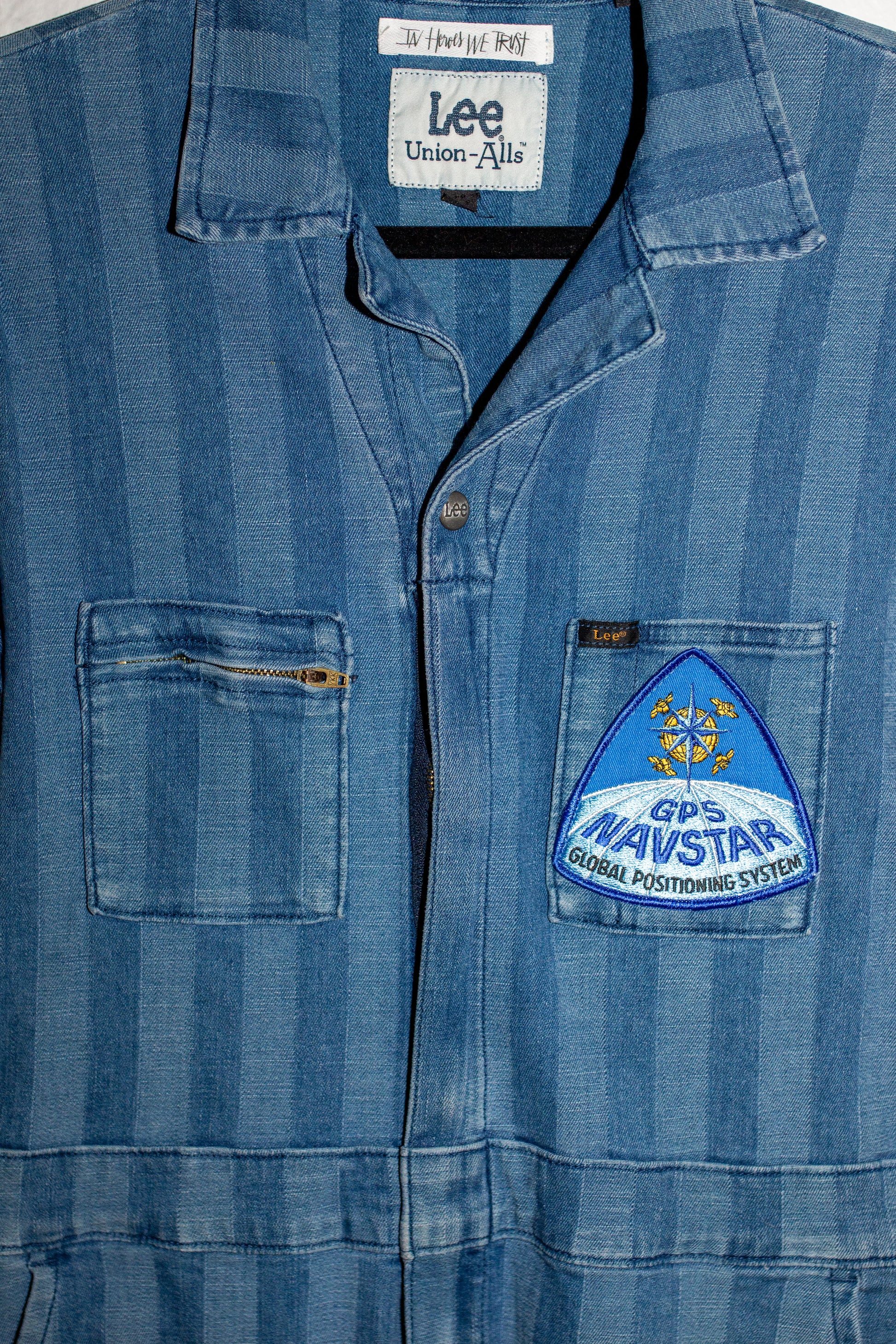 A rare find with unmistakable vintage charm. This Lee Union-Alls striped denim jumpsuit blends utilitarian workwear with a worn-in ease that only true vintage delivers. The vertical stripe pattern creates a long, clean silhouette, while the original NAVSTAR GPS patch adds a unique, archival detail you won’t see twice.